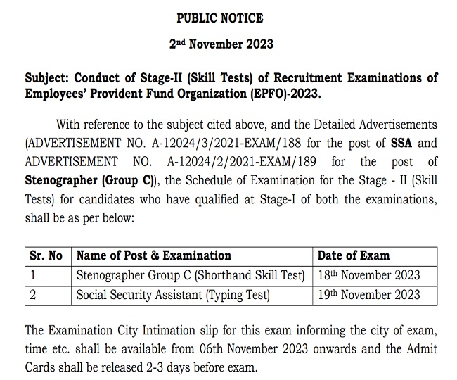 EPFO Recruitment 2023 Schedule Announced ईपीएफओ की ओर से एसएसए एवं स्टेनोग्राफर भर्ती के स्किल टेस्ट के लिए शेड्यूल की घोषणा कर दिया गया है। नोटिफिकेशन के अनुसार स्किल टेस्ट का आयोजन 18 एवं 19 नवंबर 2023 को किया जाएगा। एग्जाम में शामिल होने के लिए एग्जाम सिटी स्लिप 6 नवंबर एवं एडमिट कार्ड एग्जाम से एक या दो दिन पहले जारी कर दिए जाएंगे।