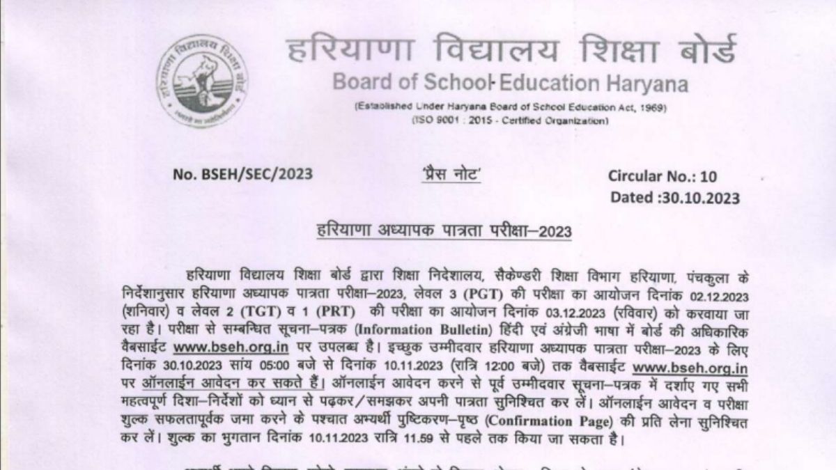 Haryana TET Exam 2023: 2 और 3 दिसंबर को होगी परीक्षा