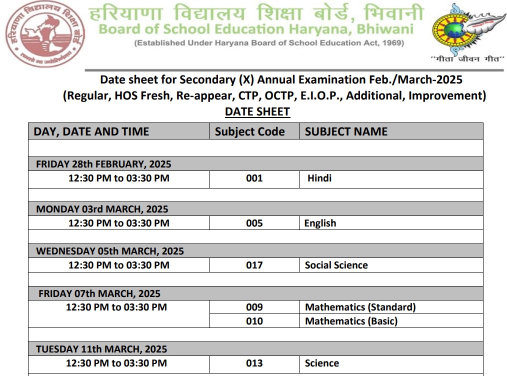 एजुकेशन डेस्क, नई दिल्ली। हरियाणा बोर्ड से दसवीं की बोर्ड परीक्षाओं में भाग लेने जा रहे स्टूडेंट्स को बता दें कि बोर्ड ऑफ स्कूल एजुकेशन हरियाणा (BSEH) की ओर से सेकेंडरी (10वीं) क्लास के वार्षिक परीक्षाओं की शुरुआत 28 फरवरी 2025 से की जाएगी। टाइम टेबल HBSE की ओर से पहले ही घोषित किया जा चुका है। 10th क्लास का पहला पेपर हिंदी का आयोजित किया जायेगा। बोर्ड की ओर से अंतिम पेपर 19 मार्च 2025 को संपन्न करवाया जायेगा। विषय एवं तिथि के अनुसार किस डेट को किस सब्जेक्ट का पेपर आयोजित किया जायेगा उसकी विस्तृत डिटेल आप यहां से चेक कर सकते हैं।