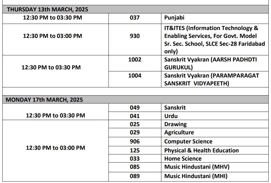 | 13 मार्च 2025 | पंजाबी, IT&ITES (Information Technology & Enabling Services, For Govt. Model Sr. Sec. School, SLCE Sec-28 Faridabad only), संस्कृत व्याकरण (AARSH PADHDTI GURUKUL & PARAMPARAGAT SANSKRIT VIDYAPEETH) |
