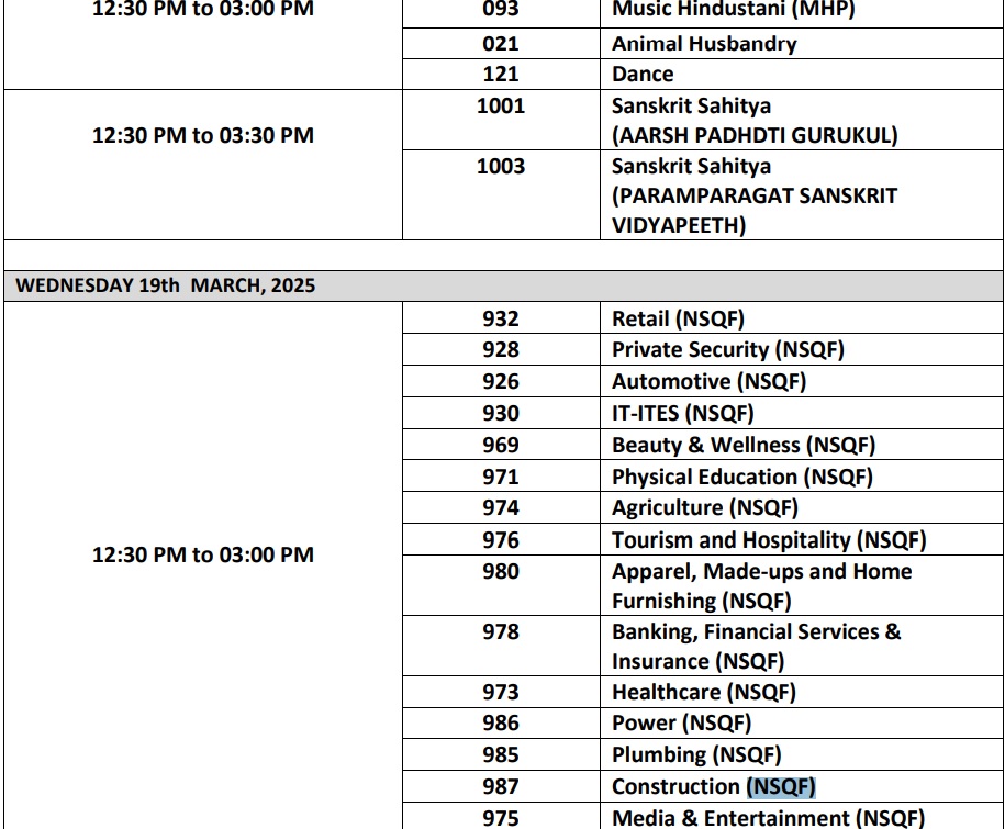 | 17 मार्च 2025 | संस्कृत, उर्दू, ड्रॉइंग, एग्रीकल्चर, कंप्यूटर साइंस, फिजिकल हेल्थ एवं एजुकेशन, होम साइंस, म्यूजिक हिंदुस्तानी (MHV), म्यूजिक हिंदुस्तानी (MHI), म्यूजिक हिंदुस्तानी (MHP), एनिमल हसबैंडरी, डांस, संस्कृत साहित्य (AARSH PADHDTI GURUKUL & PARAMPARAGAT SANSKRIT VIDYAPEETH) |