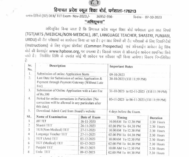 HPBOSE ने सभी 8 विषयों की टीईटी परीक्षाओं के आयोजन की तारीखों का एलान कर दिया है। अधिसूचना के मुताबिक एचपीटीईटी 2023 का आयोजन 26 नवंबर से 9 दिसंबर के बीच 2.30-2.30 घंटे की दो पालियों में किया जाएगा, जो कि सुबह 10 बजे से और दोपहर 2 बजे से शुरू होंगी।