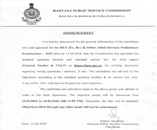 HPSC HCS Prelims 2023 Answer Key: 15 फरवरी तक दर्ज कराएं आपत्ति