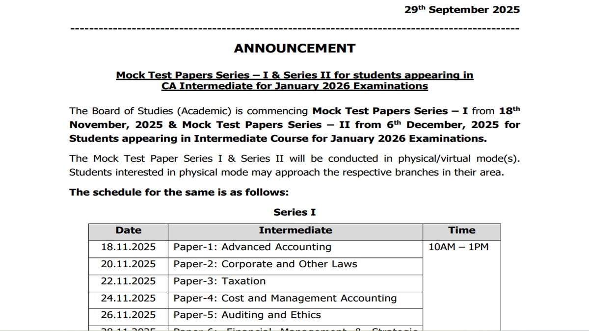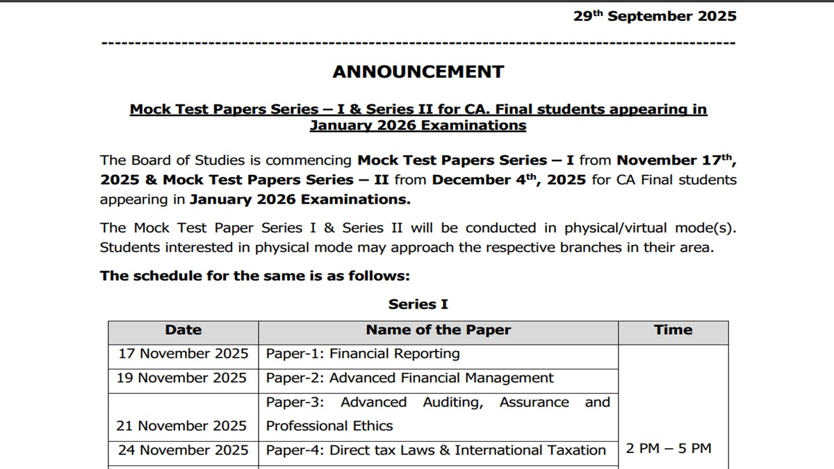 इंस्टीट्यूट ऑफ चार्टर्ड अकाउंटेंट्स ऑफ इंडिया (ICAI) की ओर से सीए फाइनल और सीए इंटरमीडिएट परीक्षा के लिए मॉक टेस्ट सीरीज का शेड्यूल जारी कर दिया गया है। सीए फाइनल परीक्षा की पहली सीरीज 17 नवंबर 2025 और सीए इंटरमीडिएट परीक्षा की पहली सीरीज 18 नवंबर 2025 से शुरू होने वाली है।
