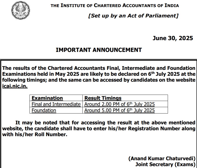 नोटिफिकेशन के मुताबिक CA Final and Intermediate एग्जाम का रिजल्ट 6 जुलाई को दोपहर 2 बजे के आसपास जारी किया जायेगा। इसके अलावा CA Foundation Result शाम को 5 बजे के आसपास घोषित होगा।