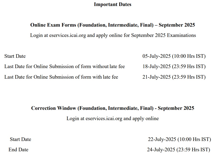 इंटरमीडिएट कोर्स एग्जामिनेशन ग्रुप 1 एग्जाम 4, 7 और 9 सितंबर एवं ग्रुप ग्रुप 2 परीक्षा 11, 13, 15 सितंबर 2025 को आयोजित की जाएगी। इन सबके अलावा फाउंडेशन कोर्स एग्जामिनेशन का आयोजन 16, 18, 20 और 22 सितंबर 2025 को आयोजित किया जायेगा। एग्जाम से कुछ दिन पूर्व अभ्यर्थियों के एडमिट कार्ड जारी कर दिए जायेंगे। अधिक डिटेल के लिए अभ्यर्थी ऑफिशियल वेबसाइट पर विजिट कर सकते हैं।