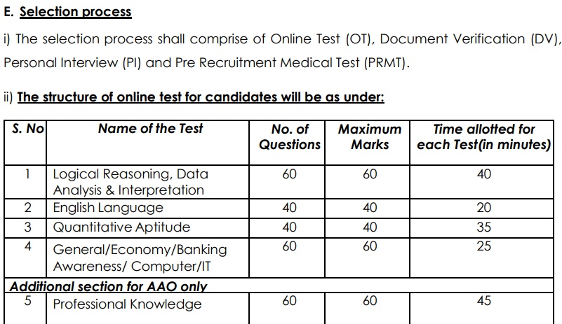 ऑनलाइन टेस्ट का आयोजन 15 दिसंबर को होगा। इस टेस्ट में उम्मीदवारों से 200 बहुविकल्पीय प्रकार के प्रश्न पूछे जायेंगे। प्रश्न पत्र हल करने के लिए अभ्यर्थियों को 2 घंटे का समय प्रदान किया जायेगा। पेपर में सवाल लॉजिकल रीजनिंग, डाटा एनालिसिस एवं इंटरप्रिटेशन, इंग्लिश लैंग्वेज, क्वांटिटेटिव एप्टीट्यूड, जनरल/ इकोनॉमी/ बैंकिंग अवेयरनेस/ कंप्यूटर/ IT विषयों से पूछे जाएंगे। AAO पदों के लिए अतिरिक्त से प्रोफेशनल नॉलेज विषय से 60 प्रश्न पूछे जायेंगे जिसको हल करने के लिए 45 मिनट का समय प्रदान किया जाएगा।