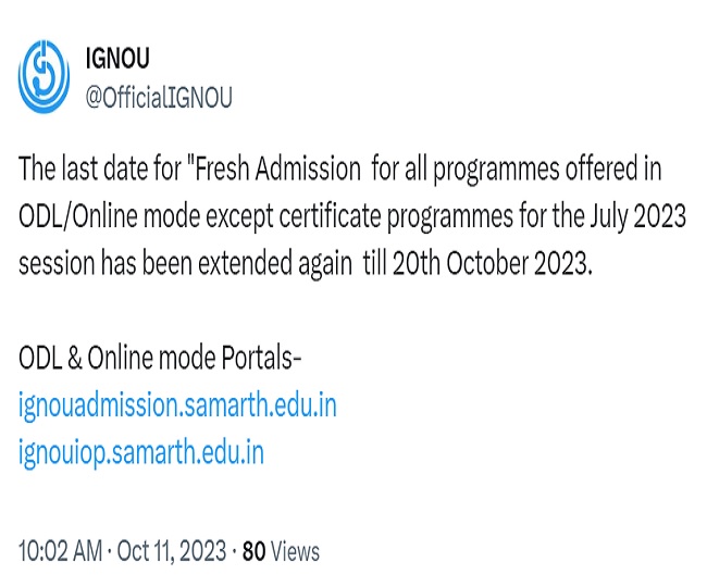 IGNOU Admission 2023 इंदिरा गांधी राष्ट्रीय मुक्त विश्वविद्यालय ने जुलाई 2023 सत्र के विभिन्न ऑनलाइन डिस्टैंस लर्निंग (ODL) डिस्टैंस लर्निंग और ऑनलाइन कोर्सेस में दाखिले के लिए आवेदन की आखिरी तारीख 20 अक्टूबर तक के लिए बढ़ा दी है। इसस पहले आवेदन की आखिरी तारीख मंगलवार 10 अक्टूबर को समाप्त हो गई थी। ऐसे में स्टूडेंट्स को 10 दिनों का अतिरिक्त समय मिल गया है।