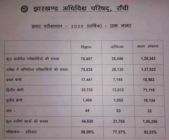 इस वर्ष की झारखण्ड इंटरमीडिएट परीक्षा में कला में 82.07%, विज्ञान में 59.72% और वाणिज्य में 77.37% छात्रों को सफल घोषित किया गया है। इस वर्ष कला संकाय में छात्राएं छात्रों से आगे हैं। कुल 84.2 फीसदी छात्राएं और 79.94 फीसदी छात्र सफल घोषित किये गये हैं। इसी प्रकार कॉमर्स और साइंस संकायों में भी छात्राएं आगे रही हैं।