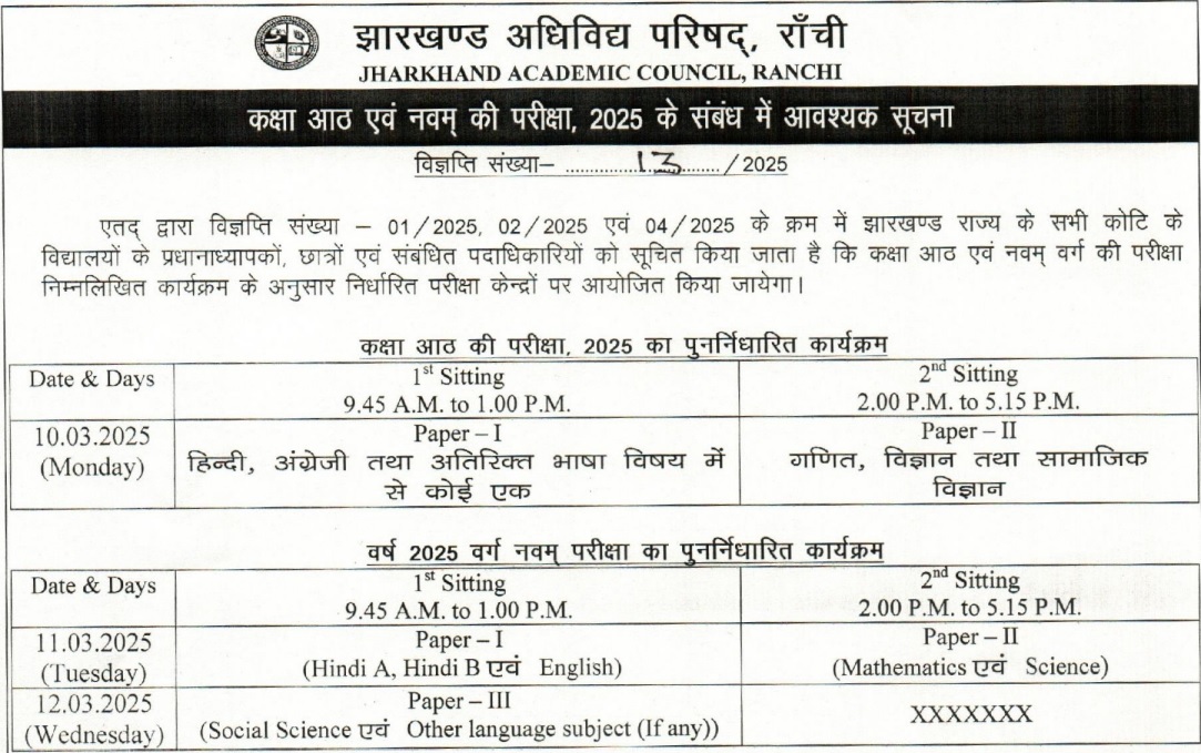 एजुकेशन डेस्क, नई दिल्ली। झारखंड अधिविद्य परिषद् रांची (JAC) की ओर से कक्षा 8वीं और 9वीं बोर्ड परीक्षाओं के लिए नया टाइम टेबल जारी कर दिया गया है। नई डेटशीट के अनुसार कक्षा 8वीं की बोर्ड परीक्षाओं का आयोजन 8 मार्च 2025 को करवाया जायेगा वहीं क्लास 9th की बोर्ड परीक्षाओं का आयोजन 11 एवं 12 मार्च 2025 को करवाया जायेगा।
