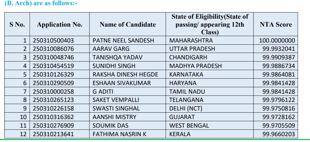 बीआर्क में महाराष्ट्र के PATNE NEEL SANDESH ने 100 पर्सेंटाइल हासिल किया है वहीं बीप्लानिंग में मध्य प्रदेश की SUNIDHI SINGH ने 100 पर्सेंटाइल हासिल किया है।