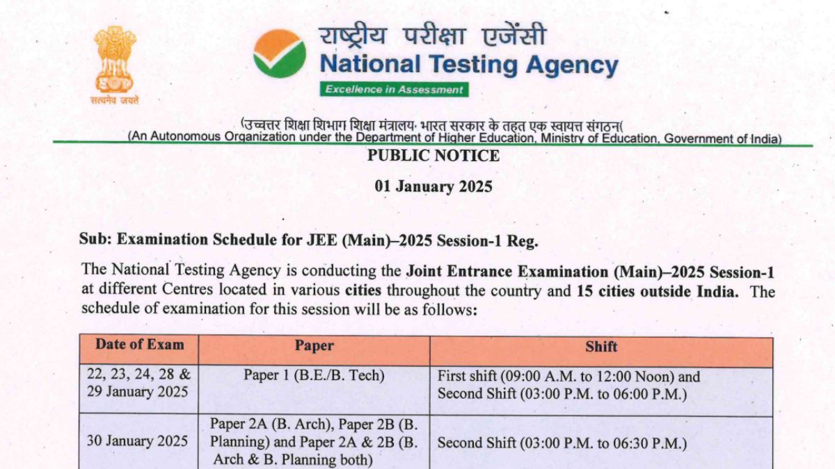 JEE Main 2025 Schedule Out: जेईई मेन सेशन 1 एग्जाम शेड्यूल जारी, 22 Jan से शुरू होगी पहले पेपर के लिए परीक्षा