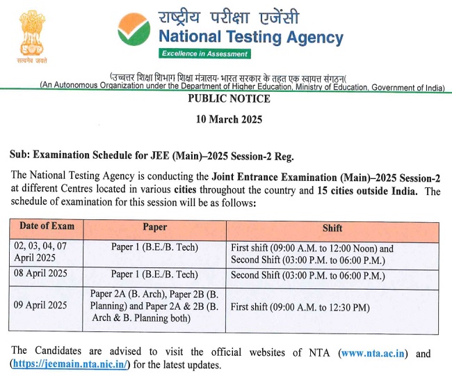एजुकेशन डेस्क, नई दिल्ली। नेशनल टेस्टिंग एजेंसी (NTA) की ओर से ज्वाइंट एंट्रेस एग्जामिनेशन मेंस सेशन 2 एग्जाम डेट (JEE Mains 2025 Session 2 Schedule) जारी कर दिया गया है। एनटीए की ओर से एग्जाम डेट की घोषणा एनटीए की ऑफिशियल वेबसाइट jeemain.nta.nic.in पर नोटिफिकेशन साझा कर की गई है। अधिसूचना में दी गई डिटेल के मुताबिक जेईई मेन सेशन 2 एग्जाम का आयोजन 2 से लेकर 9 अप्रैल 2025 तक करवाया जायेगा।
