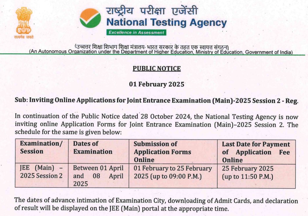 नेशनल टेस्टिंग एजेंसी (NTA) की ओर से ज्वाइंट एंट्रेस एग्जामिनेशन (मेंस) सेशन 2 के लिए रजिस्ट्रेशन प्रॉसेस शुरू हो चुकी है। जो भी छात्र 2nd सेशन की परीक्षा में भाग लेना चाहते हैं वे निर्धारित अंतिम तिथि 25 फरवरी 2025 तक ऑनलाइन माध्यम से आवेदन प्रक्रिया पूर्ण कर सकते हैं। परीक्षा का आयोजन 1 से लेकर 8 अप्रैल 2025 तक करवाया जायेगा।
