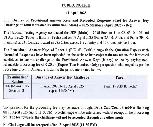 छात्रों को बता दें कि जेईई मेन आंसर की पर आपत्ति दर्ज करने के लिए 200 रुपये प्रति प्रश्न का भुगतान करना होगा। फीस डेबिट कार्ड, क्रेडिट कार्ड, नेट बैंकिंग माध्यम से जमा की जा सकती है।