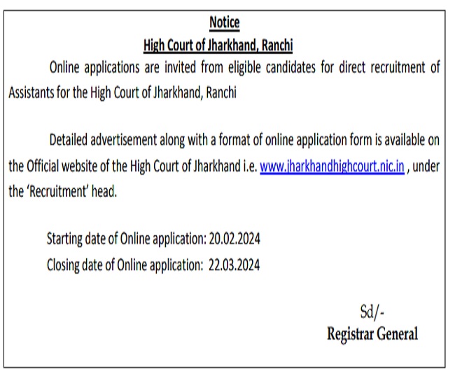 Jharkhand HC Recruitment 2024: झारखंड हाई कोर्ट में असिस्टेंट पदों पर भर्ती के लिए नोटिफिकेशन जारी, आवेदन 20 फरवरी से होंगे शुरू