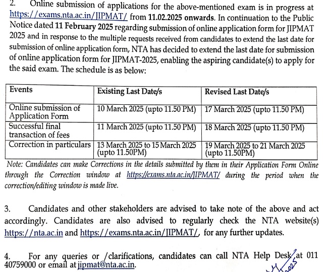 एग्जाम से जुड़ी किसी भी प्रकार की जानकारी या समस्या के लिए स्टूडेंट्स NTA के हेल्प डेस्क नंबर 011 40759000 पर या ईमेल आईडी jipmat@nta.ac.in पर संपर्क कर सकते हैं।