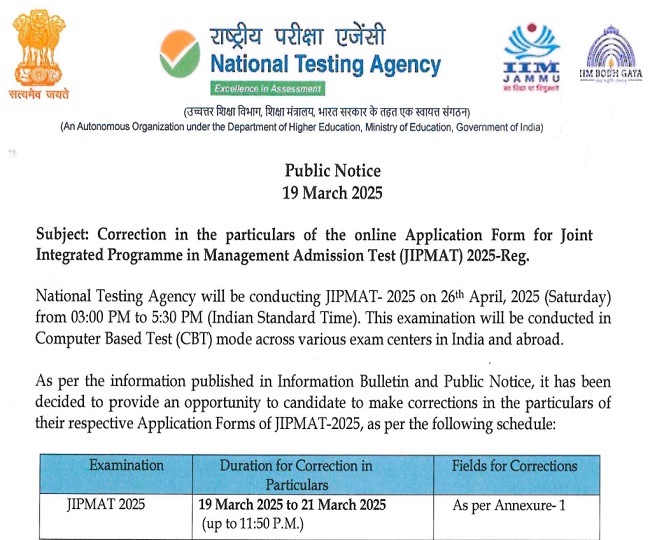 JIPMAT 2025: जिपमैट एप्लीकेशन फॉर्म में करेक्शन के लिए विंडो ओपन, 21 मार्च तक कर सकते हैं संशोधन