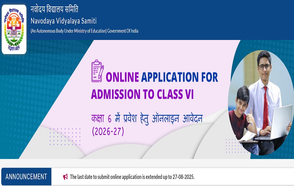 जवाहर नवोदय विद्यालय चयन परीक्षा (JNVST 2026-27) के लिए आवेदन की लास्ट डेट आज यानी 27 अगस्त निर्धारित है। ऐसे में जो अभिभावक अपने बच्चों को कक्षा 6 में प्रवेश दिलवाना चाहते हैं वे तुरंत ही ऑनलाइन माध्यम से फॉर्म भर सकते हैं। एप्लीकेशन फॉर्म पूर्ण रूप से निशुल्क रूप से भरा जा सकता है।