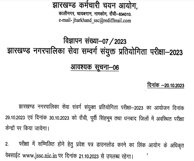झारखंड नगर पालिका सेवा संवर्ग संयुक्त प्रतियोगिता परीक्षा 2023 का आयोजन 29 अक्टूबर और 30 अक्टूबर 2023 को किया जायेगा। इस प्रतियोगिता परीक्षा का आयोजन रांची, पूर्वी सिंहभूम तथा धनबाद जिलों में अवस्थित परीक्षा केंद्रों पर किया जाएगा। अभ्यर्थी एग्जाम सेंटर पर एडमिट कार्ड और एक वैलिड पहचान पत्र की प्रति अवश्य लेकर जाएं, बिना एडमिट कार्ड और वैलिड पहचान पत्र के आपको परीक्षा देने से वंचित किया जा सकता है।