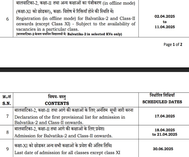 जो पेरेंट्स अपने केंद्रीय विद्यालय में अपने बच्चों को बाल वाटिका 2 और कक्षा 2 में प्रवेश दिलवाना चाहते हैं वे 2 अप्रैल से ऑनलाइन माध्यम से रजिस्ट्रेशन कर पाएंगे। इन कक्षाओं के लिए केवीएस की ओर से एप्लीकेशन विंडो 2 अप्रैल से 11 अप्रैल 2025 तक खोली जाएगी।