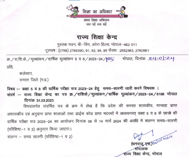 मध्य प्रदेश स्कूल शिक्षा विभाग के राज्य शिक्षा केंद्र द्वारा जारी परीक्षा कार्यक्रम के अनुसार परीक्षाएं पांचवीं के एग्जाम 13 मार्च तक और आठवीं के 14 मार्च तक विभिन्न तिथियों पर 2.30-2.30 घंटे की एकल पालियों में आयोजित किए जाने हैं।