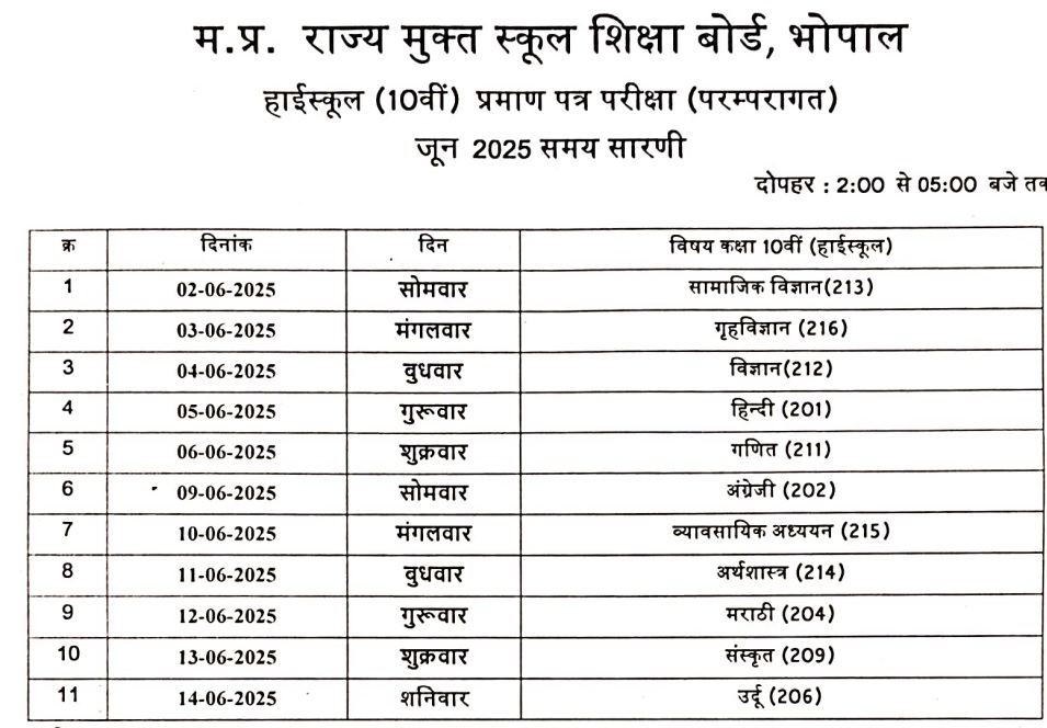 एजुकेशन डेस्क, नई दिल्ली। मध्य प्रदेश राज्य मुक्त स्कूल शिक्षा बोर्ड की ओर से हाई स्कूल (10th) एवं इंटरमीडिएट (12th) (परम्परागत) जून 2025 सेशन एग्जाम के लिए टाइम टेबल जारी कर दिया गया है। जिन भी छात्रों ने जून 2025 सेशन में एग्जाम देने के लिए आवेदन किया था वे यहां से सब्जेक्ट एवं डेट के अनुसार पूरा टाइम टेबल चेक कर सकते हैं। आपको बता दें कि डेटशीट के मुताबिक 10वीं की परीक्षाओं का आयोजन 2 जून से 14 जून 2025 तक एवं 12वीं की परीक्षाओं का आयोजन 2 जून से 20 जून 2025 तक करवाया जायेगा।