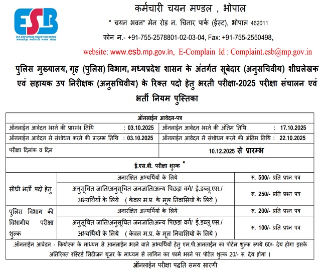 एजुकेशन डेस्क, नई दिल्ली। मध्य प्रदेश कर्मचारी चयन मंडल (MPESB) की ओर से पुलिस विभाग में कॉन्स्टेबल के बाद असिस्टेंट सब-इंस्पेक्टर (ASI) एवं सूबेदार (Stenographer) पदों पर नोटिफिकेशन जारी कर भर्ती का एलान किया गया है। अधिसूचना के मुताबिक इस भर्ती के लिए ऑनलाइन आवेदन प्रक्रिया 3 अक्टूबर 2025 से स्टार्ट की जाएगी। जो भी अभ्यर्थी इस भर्ती के लिए पात्रता पूरी करते हैं वे केवल ऑनलाइन माध्यम से एमपीईएसबी की ऑफिशियल वेबसाइट esb.mp.gov.in पर जाकर निर्धारित अंतिम तिथि 17 अक्टूबर तक फॉर्म भर सकेंगे।