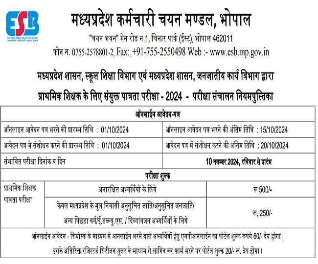 एजुकेशन डेस्क, नई दिल्ली। प्राइमरी स्कूल में शिक्षक बनने के लिए प्राथमिक शिक्षक के लिए संयुक्त पात्रता परीक्षा 2024 उत्तीर्ण होना आवश्यक है। इस एग्जाम का आयोजन प्रतिवर्ष किया जाता है। इस वर्ष के लिए राज्य कर्मचारी चयन मंडल (MPESB) की ओर से के लिए एप्लीकेशन प्रॉसेस 1 अक्टूबर 2024 से स्टार्ट कर दी गई है। इच्छुक एवं योग्य उम्मीदवार ऑनलाइन माध्यम से MPESB की ऑफिशियल वेबसाइट esb.mp.gov.in पर जाकर फॉर्म भर सकते हैं। इसके साथ ही आप इस पेज पर दिए डायरेक्ट लिंक पर क्लिक करके भी आवेदन प्रक्रिया पूर्ण कर सकते हैं।