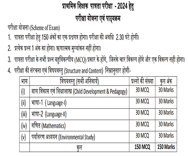 एमपी टीईटी परीक्षा में उम्मीदवारों से 150 प्रश्न बहुविकल्पीय प्रकार के पूछे जाएंगे। प्रश्न पत्र हल करने के लिए उम्मीदवारों को 2 घंटे 30 मिनट का समय प्रदान किया जायेगा। प्रश्न बाल विकास एवं शिक्षा शास्त्र, भाषा 1, भाषा 2, गणित, पर्यावरण अध्ययन से प्रश्न पूछे जायेंगे। प्रत्येक खंड से 30 प्रश्न पूछे जाएंगे। भर्ती से जुड़ी अधिक जानकारी के लिए अभ्यर्थी ऑफिशियल वेबसाइट पर विजिट कर सकते हैं।