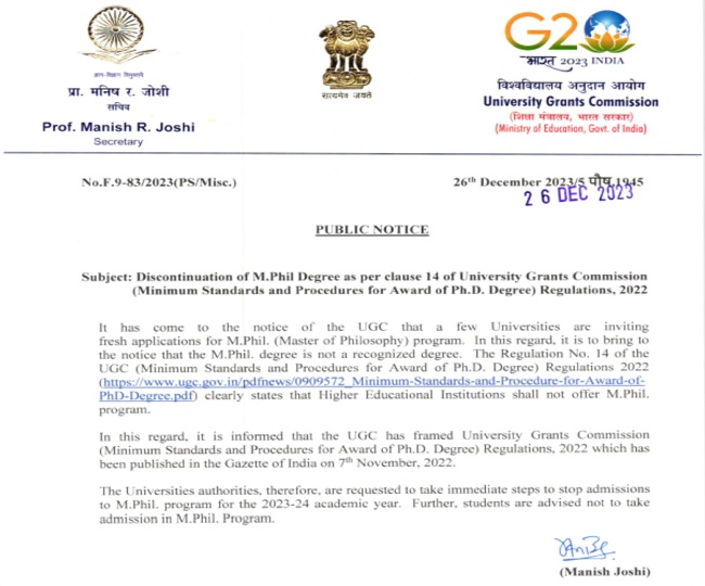 यूजीसी के सचिव मनीष आर. जोशी की तरफ से मंगलवार, 26 दिसंबर 2023 को जारी पब्लिक नोटिस के मुताबिक कुछ विश्वविद्यालयों द्वारा एमफिल कोर्स में दाखिले के लिए आवेदन आमंत्रित किए जा रहे हैं। इस सम्बन्ध में आयोग ने अपने नोटिस में स्पष्ट किया कि एमफिल वैलिड डिग्री नहीं है। ऐसे में स्टूडेंट्स को किसी भी उच्च शिक्षा संस्थान द्वारा ऑफर किए जा रहे एमफिल कोर्स में एडमिशन नहीं लेना चाहिए।