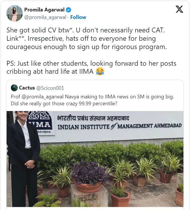 नव्या ने अपनी पोस्ट में लिखा, 'सपने सच होते हैं! अगले 2 साल...सर्वोत्तम लोगों और संकाय के साथ!ब्लेंडेड पोस्ट ग्रेजुएट प्रोग्राम (बीपीजीपी) 2026 की क्लास।' उनकी इस पोस्ट के बाद लोगों ने लगातार सवाल पूछे कि उन्होंने कैट परीक्षा कब दी, उनके कितने मार्क्स आए और उन्हें एडमिशन कैसे मिला।