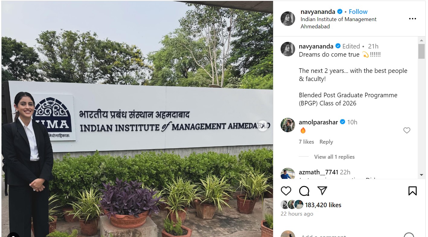 डिजिटल डेस्क, नई दिल्ली। बॉलीवुड सुपरस्टार अमिताभ बच्चन की नातिन नव्या नवेली नंदा की एक पोस्ट ने सोशल मीडिया में काफी हलचल पैदा कर दी है और लोग लगातार इस पर चर्चा कर रहे हैं। दरअसल नव्या नंदा ने सोमवार को अपने इंस्टाग्राम में पोस्ट करते हुए बताया कि उन्होंने प्रतिष्ठित आईआईएम अहमदाबाद में एडमिशन लिया है और वहां पढ़ाई शुरू करने जा रही हैं।