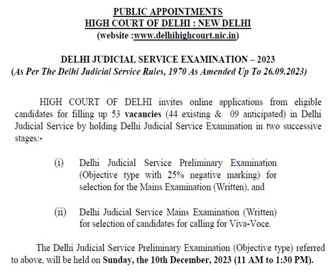 दिल्ली न्यायिक सेवा परीक्षा 2023 अधिसूचना लिंक