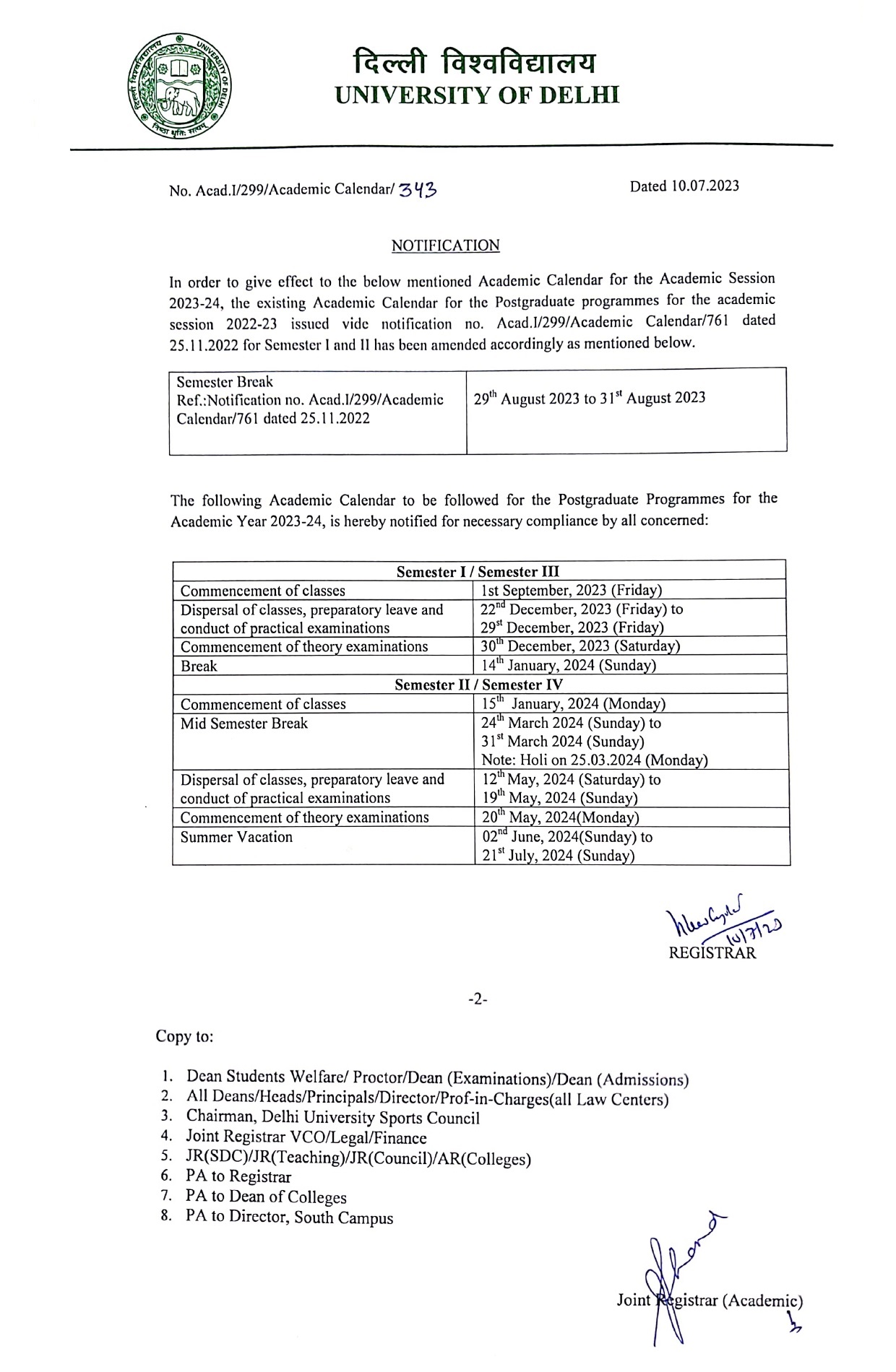 दूसरी तरफ, दिल्ली विश्वविद्यालय के वार्षिक सत्रीय कार्यक्रम 2023-24 के मुताबिक सेमेस्टर 2 और 4 के स्टूडेंट्स के लिए मिड-सेमेस्टर ब्रेक 34 से 31 मार्च तक दिया जाएगा। इसी दौरान होली की छुट्टी के लिए 25 मार्च की तारीख निर्धारित की गई है। इसके बाद, कक्षाओं की समाप्ति, परीक्षाओं की तैयारी के लिए छुटियां और इसी दौरान प्रैक्टिकल एग्जाम का आयोजन 12 से 19 मई 2024 तक किया जाएगा। इसके बाद थ्योरी एग्जाम 20 मई से होंगे। डीयू ने समर वेकेशन के लिए 2 जून से 21 जुलाई 2024 तक की अवधि निर्धारित की है।