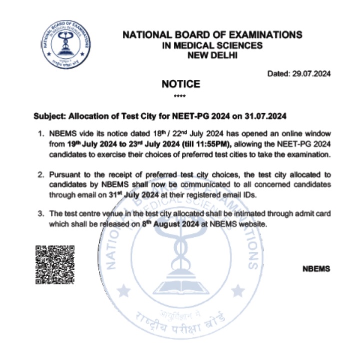 बता दें कि इससे पहले NBEMS ने NEET PG 2024 के लिए आवेदन किए उम्मीदवारों को आवंटित परीक्षा शहर की जानकारी के लिए ‘एडवांस सिटी इंटीमेशन स्लिप’ जारी की थी ताकि उम्मीदवार समय रहते अपना एग्जाम-डे ट्रैवल प्लान बना सकें। वहीं, आवंटित परीक्षा शहर में किस केंद्र पर परीक्षा देनी है इसकी जानकारी बोर्ड द्वारा प्रवेश पत्र (NEET PG Admit Card 2024) के माध्यम से उम्मीदवारों को दी जाएगी।