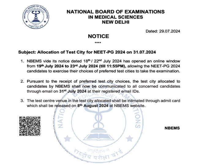 NEET PG 2024 Exam City: natboard.edu.in से करें डाउनलोड