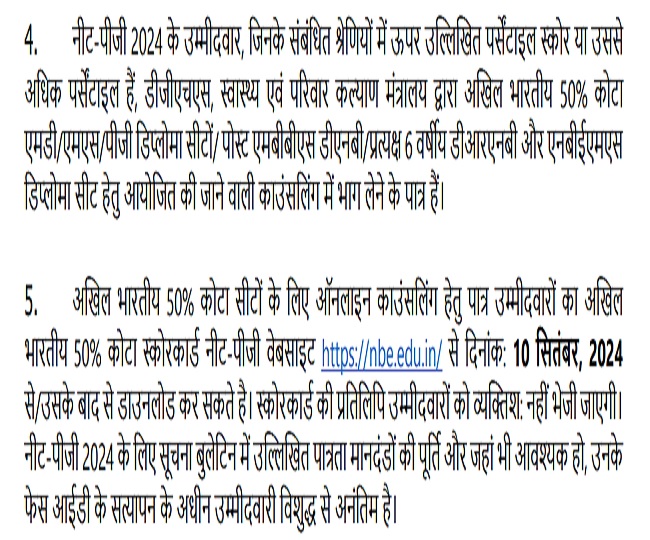 आपको बता दें कि नीट पीजी काउंसिलिंग तीन चरणों में पूर्ण की जाएगी। पहले चरण की काउंसिलिंग समाप्त होने के बाद दूसरे चरण की काउंसिलिंग 14 अक्टूबर से 2 नवंबर एवं तीसरे चरण की काउंसिलिंग 7 नवंबर से 5 दिसंबर 2024 तक पूर्ण की जाएगी। अधिक जानकारी के लिए अभ्यर्थी हेल्प डेस्क नंबर 011-45593000 पर संपर्क कर सकते हैं।