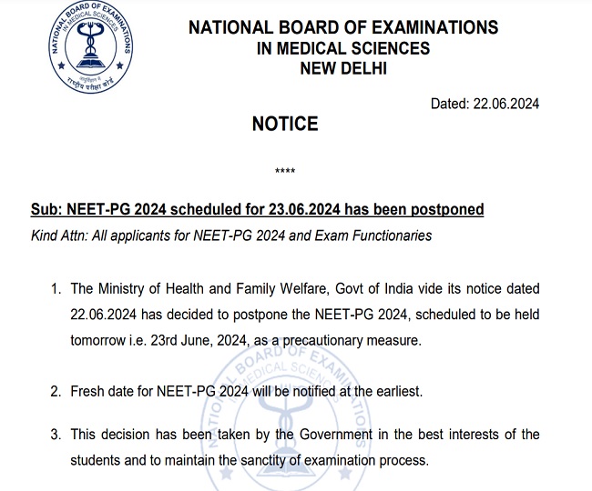 सरकार द्वारा छात्रों के सर्वोत्तम हित में और परीक्षा प्रक्रिया की पवित्रता बनाए रखने के लिए मिनिस्ट्री ऑफ हेल्थ एंड फैमिली वेलफेयर की ओर से आज यानी 23 जून 2024 को आयोजित होने वाले राष्ट्रीय पात्रता सह प्रवेश परीक्षा- पीजी (NEET PG) 2024 एग्जाम को स्थगित कर दिया गया है। एग्जाम की नई डेट की घोषणा जल्द ही ऑफिशियल वेबसाइट पर की जाएगी।