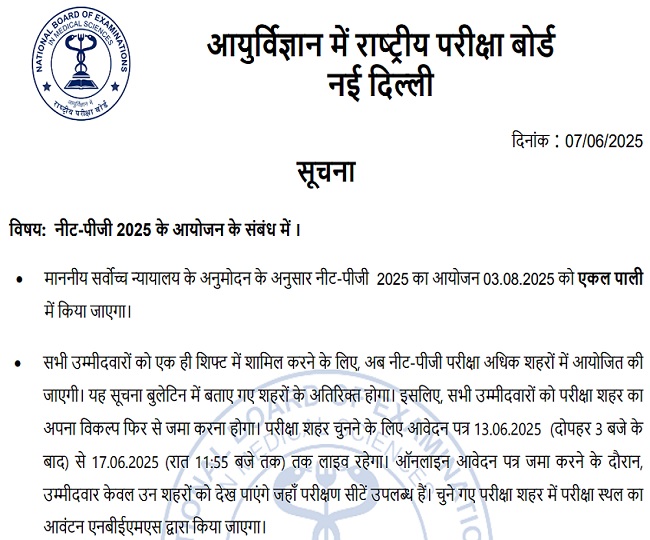पहले परीक्षा 15 जून को एक पाली में आयोजित होनी थी लेकिन एनबीईएमएस की ओर से इसे तकनीकी और व्यावहारिक दिक्कतें बताते हुए कोर्ट में अर्जी दाखिल कर परीक्षा की तारीख बढ़ा कर तीन अगस्त करने की इजाजत मांगी थी। न्यायमूर्ति पीके मिश्रा और न्यायमूर्ति एजी मसीह की पीठ ने शुक्रवार को एनबीईएमएस की अर्जी स्वीकार करते हुए तीन अगस्त को परीक्षा कराने की इजाजत दे दी।