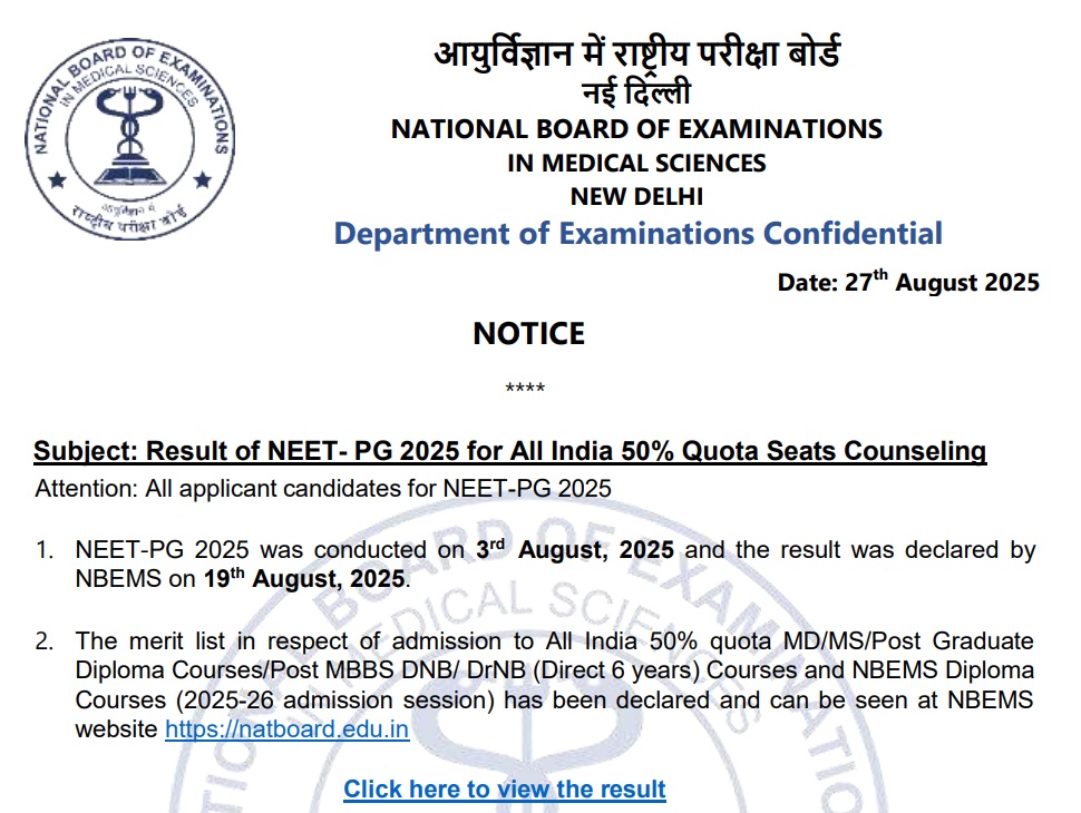 NEET PG Result 2025: NBEMS ने 50% AIQ सीटों के लिए मेरिट लिस्ट की जारी, रोल नंबर वाइज चेक करें परिणाम