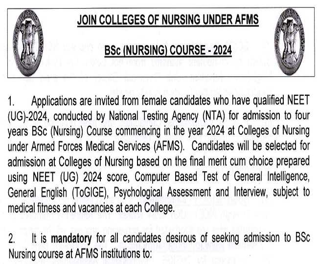 NEET UG 2024: आर्मी बीएससी नर्सिंग एडमिशन के लिए आवेदन स्टार्ट, नीट यूजी में क्वालिफाइड अभ्यर्थी कर सकते हैं अप्लाई