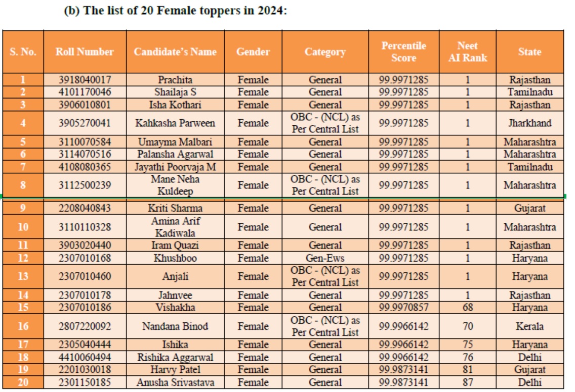 NTA द्वारा मंगलवार 4 जून को जारी जारी NEET UG 2024 परिणाम अधिसूचना के मुताबिक AIR 1 प्राप्त करने वाली टॉप 20 महिला उम्मीदवारों (NEET UG 2024 Female Toppers) में राजस्थान की प्राचिता (रोल नंबर 3918040017) तमिलनाडु की शैलजा एस (रोल नंबर 4101170046) और राजस्थान की ईशा कोठारी (रोल नंबर 3906010801) भी शामिल हैं। इन सभी ने 99.9971285 पर्सेंटाइल स्कोर अर्जित किया।