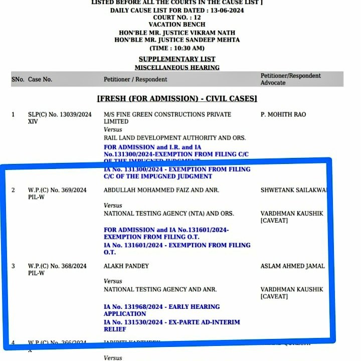 बता दें कि मेडिकल, डेंटल, आयुष और नर्सिंग स्नातक प्रवेश के लिए राष्ट्रीय परीक्षा एजेंसी (NTA) द्वारा 4 जून को आयोजित राष्ट्रीय पात्रता सह प्रवेश परीक्षा - यूजी (NEET UG) 2024 को रद्द करके फिर से आयोजन किए जाने की मांग वाली याचिका पर उच्चतम न्यायालय (Supreme Court) में आज यानी बृहस्पतिवार, 13 जून को फिर सुनवाई होनी थी। सर्वोच्च न्यायालय के न्यायाधीशों न्यायमूर्ति विक्रम नाथ और न्यामूर्ति संदीप मेहता की ग्रीष्मकालीन विशेष खण्डपीठ (Vacation Bench) द्वारा इस याचिका आज सुबह 10.30 बजे से सुनवाई होनी थी।