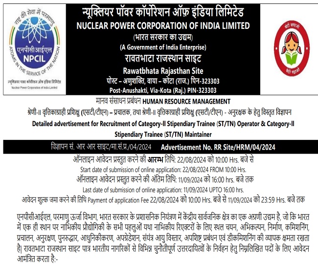 NPCIL Recruitment 2024: एनपीसीआईएल में स्टाइपेन्ड्री ट्रेनी एवं मेंटेनर भर्ती के लिए अधिसूचना जारी, आवेदन इस डेट से होंगे शुरू