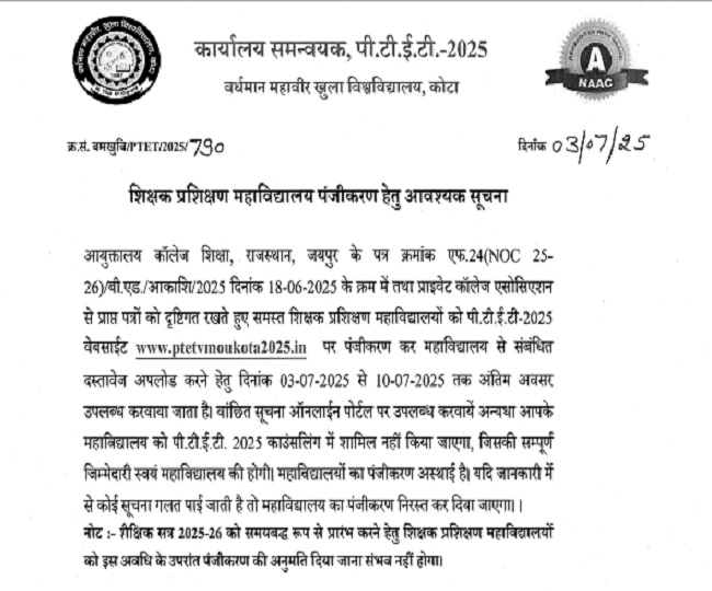 काउंसिलिंग प्रक्रिया स्टार्ट होने से पहले VMOU की ओर से महाविद्यालयों को रजिस्ट्रेशन करने के लिए महत्वपूर्ण सूचना साझा की गई है। अधिसूचना के मुताबिक जो भी महाविद्यालय अभी तक रजिस्ट्रेशन प्रक्रिया पूर्ण नहीं कर सके हैं उनको 3 जुलाई से लेकर 10 जुलाई 2025 तक का मौका दिया गया है। कॉलेज ऑफिशियल वेबसाइट ptetvmoukota2025.in पर जाकर महाविद्यालय पंजीकरण करवा सकते हैं। इस डेट के बाद किसी भी महाविद्यालय को रजिस्ट्रेशन का मौका नहीं दिया जायेगा।