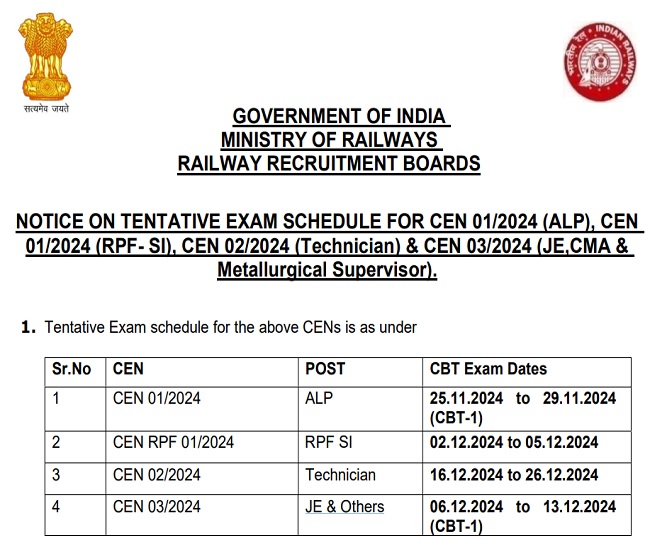 आरआरबी की ओर से जारी किये गए शेड्यूल के मुताबिक RRB ALP (CEN 01/2024) के लिए सीबीटी 1 परीक्षा का आयोजन 25 नवंबर से 29 नवंबर 2024 तक करवाया जाएगा। RPF SI (CEN RPF 01/2024) परीक्षा का आयोजन 2 से 5 दिसंबर 2024 तक किया जाएगा। आरआरबी टेक्नीशियन (CEN 02/2024) भर्ती परीक्षा 16 से 26 दिसंबर 2024 तक संपन्न करवाई जाएगी। इसके अलावा JE & Others (CEN 03/2024) के लिए सीबीटी 1 एग्जाम का आयोजन 6 दिसंबर से 13 दिसंबर 2024 तक देशभर में निर्धारित परीक्षा केंद्रों पर किया जाएगा।