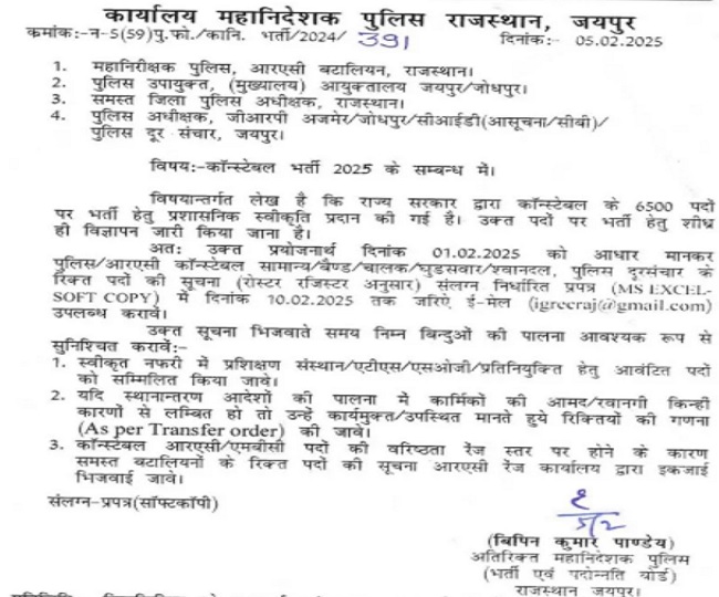 Rajasthan Police Bharti 2025: राजस्थान में पुलिस कॉन्स्टेबल के 6500 पदों पर भर्ती के लिए मिली मंजूरी, जानें कब जारी होगी अधिसूचना