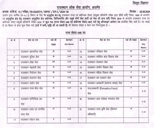 इस वर्ष आरपीएससी की ओर से यह भर्ती कुल 733 रिक्त पदों को भरने के लिए निकाली गई है। पदानुसार भर्ती विवरण निम्नलिखित है -