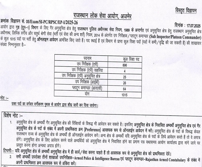 Rajasthan SI Vacancy 2025: राजस्थान एसआई, प्लाटून कमांडर पदों पर जल्द कर लें अप्लाई, आज है फॉर्म भरने की लास्ट डेट